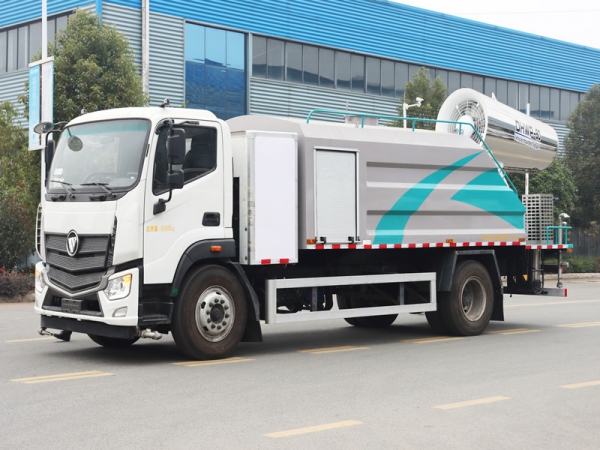 工作原理:采用自吸式雙級離心泵,效率高、灑水寬度大、水槍射程遠,低壓水泵由底盤變速器取力器通過傳動軸直接傳動。霧炮機組由底盤電池帶動霧炮風扇電機、不銹鋼多級離心泵,進行噴霧降塵工作。
